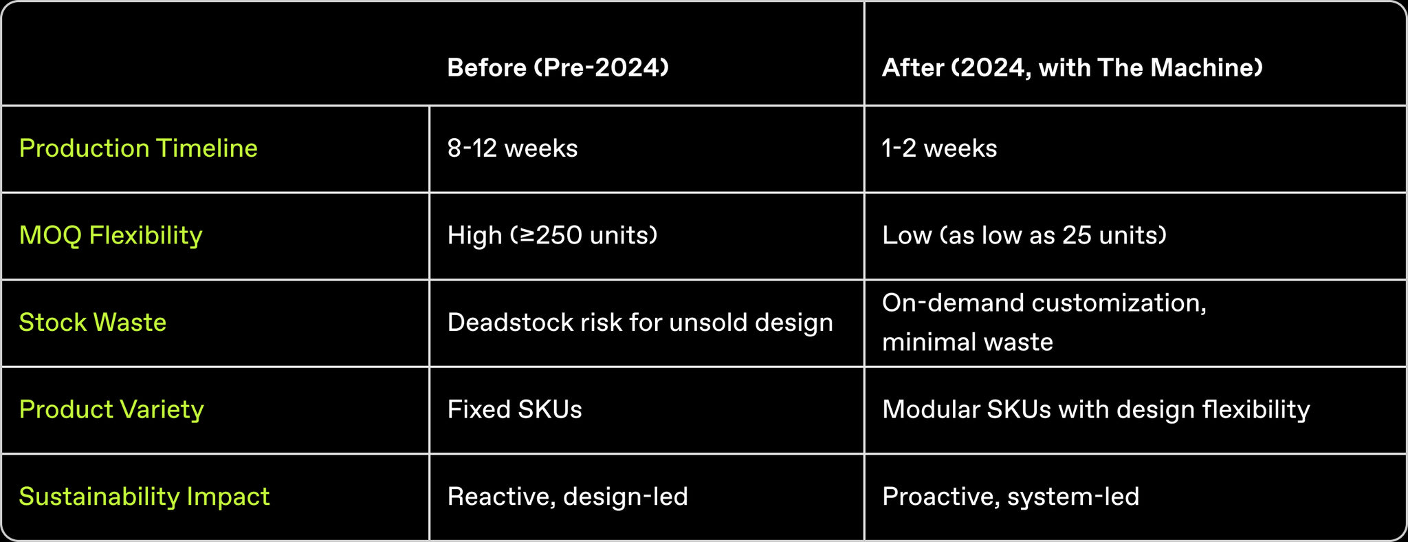 By holding base stock and customizing on demand, we reduce unsold inventory and free up warehouse space — both physically and environmentally.